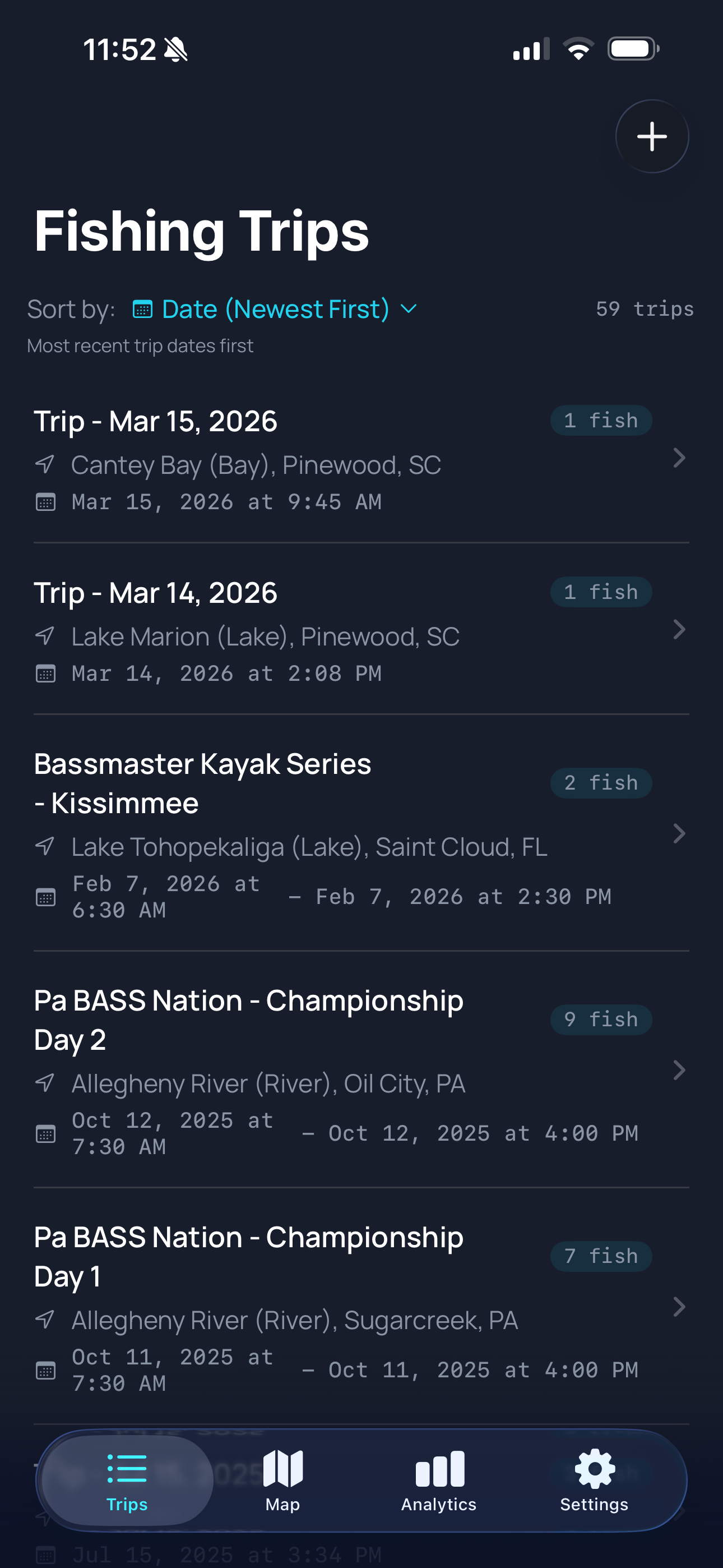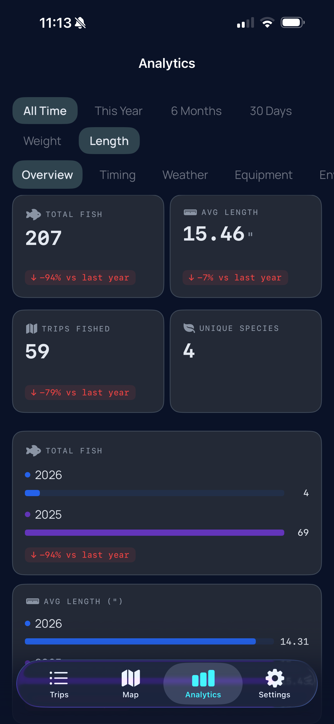 Tournament-grade fishing analytics for serious anglers. Log every catch and surface patterns across timing, weather, gear, and location. No social feed. No noise. Just your data — and only yours.